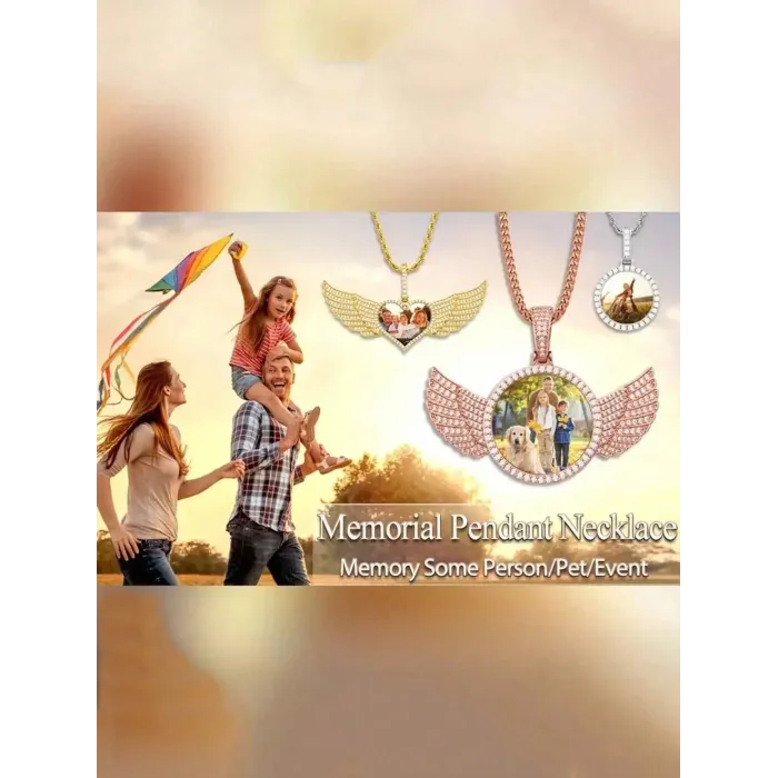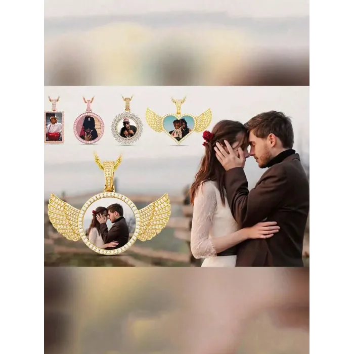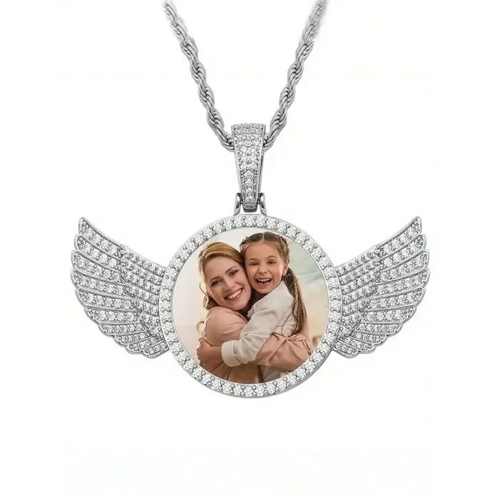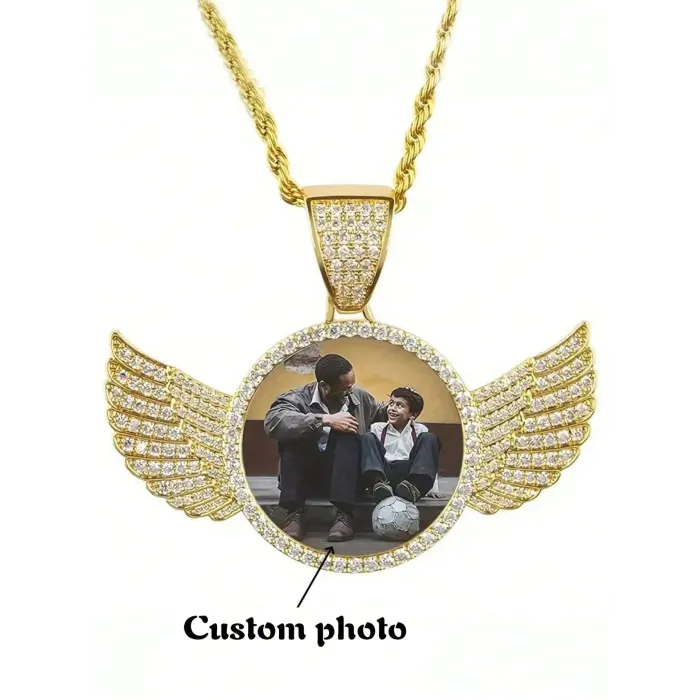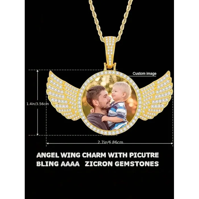 This elegant pendant necklace features a custom photo insert framed by sparkling angel wings and a diamond-encrusted border. Crafted in a hip hop style with a gold-tone finish, it’s designed as a meaningful keepsake for loved ones. The chain is adjustable and suitable for daily wear or special occasions, making it a heartfelt gift for couples, parents, or friends.