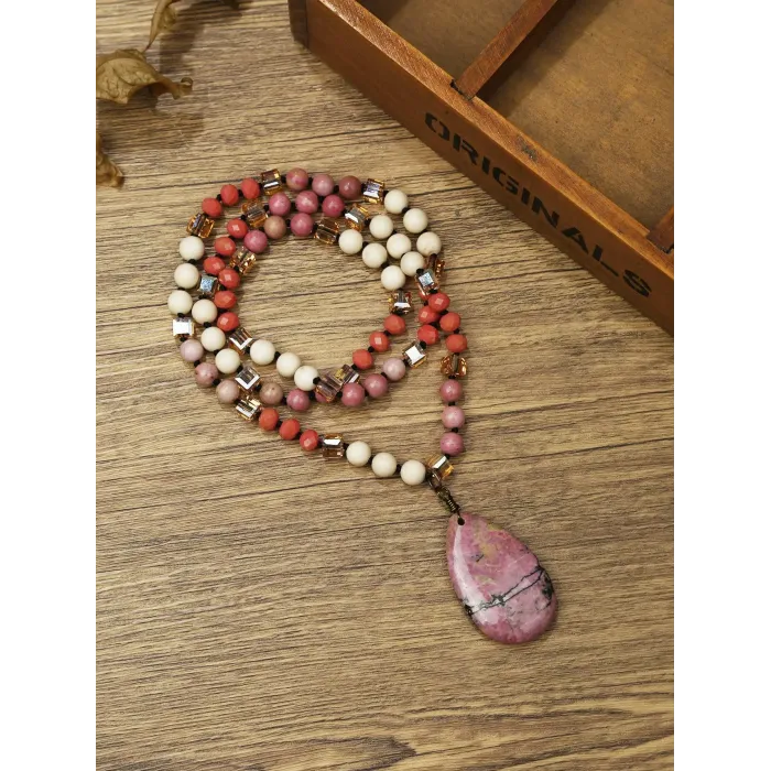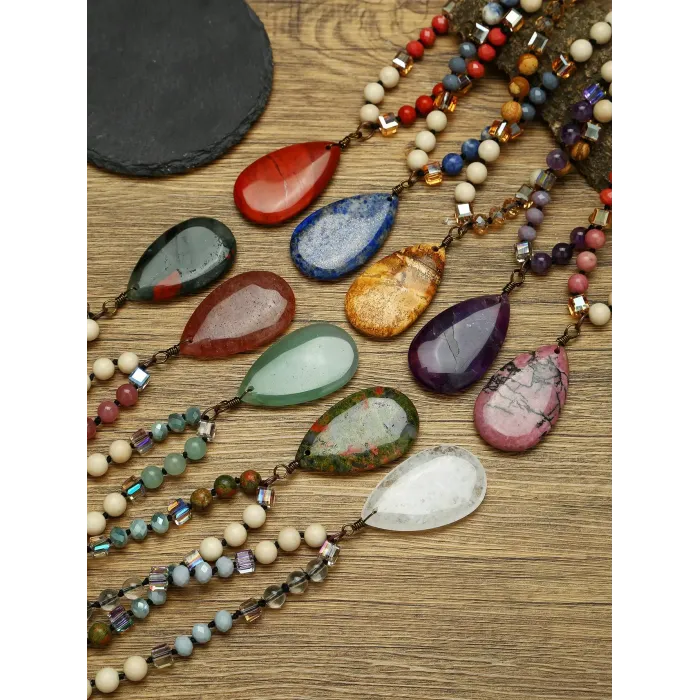 Handmade Long Necklace with Blue Lapis Lazuli Pendant, Natural Stone & Crystal Beads, Boho Style