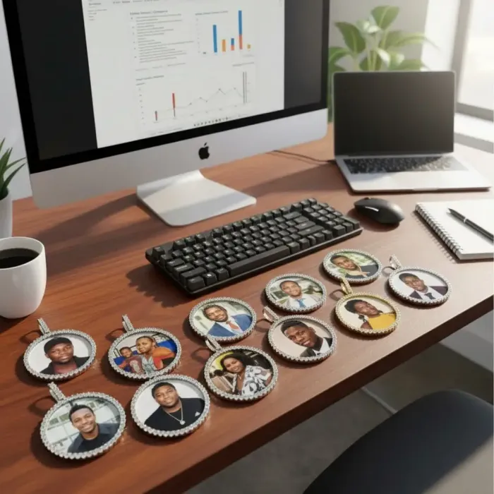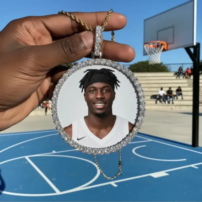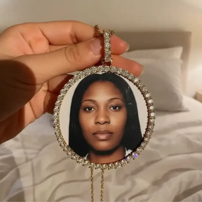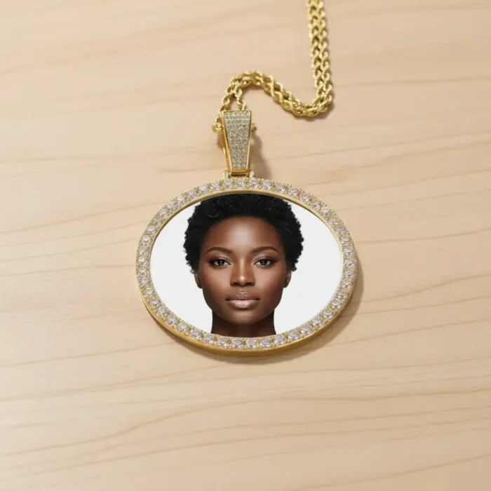 Men's Custom Photo Pendant Necklace - Large Round Frame with Cubic Zirconia, Gold-Tone Chain, Made in USA
