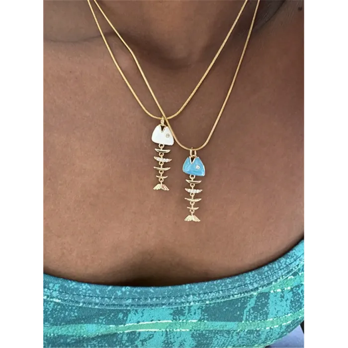 Mint Beaded Layered Necklace with Enamel Fish & Bone Charms, Gold-Tone Multi-Pendant Design
