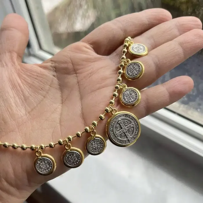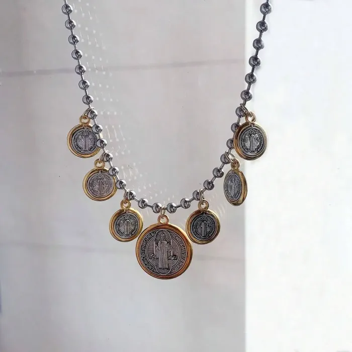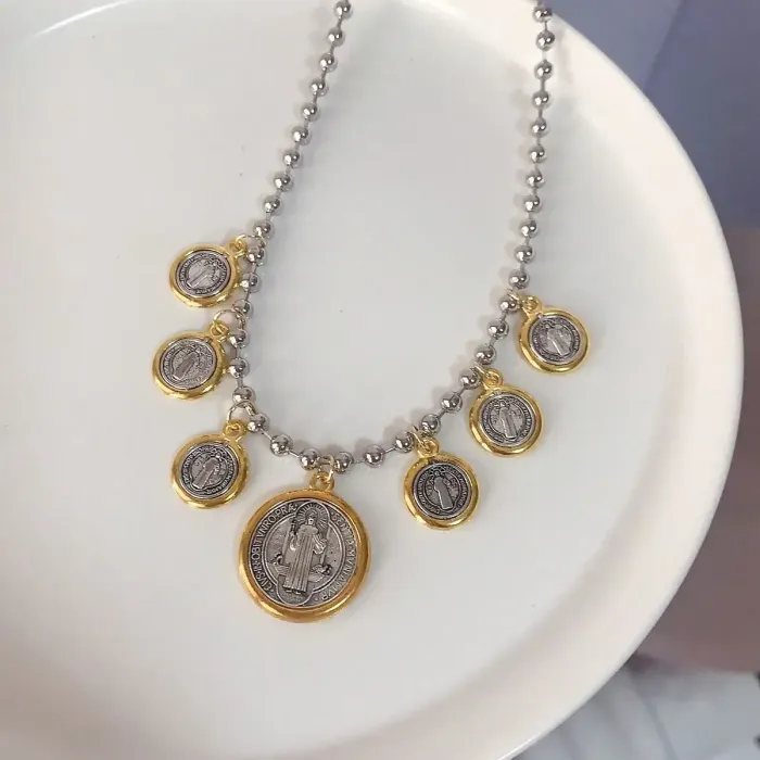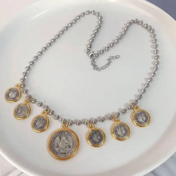 Multi-Charm Religious Pendant Necklace with Ball Chain, Gold & Silver Tone Metal Alloy