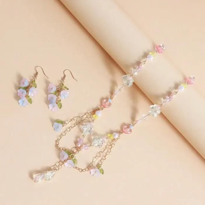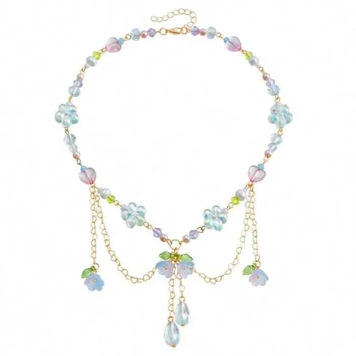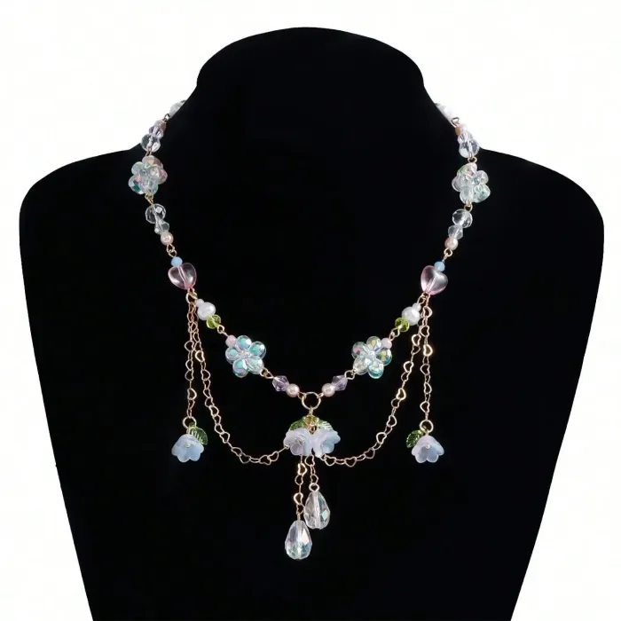 Pastel Floral Layered Necklace with Crystal Beads and Pearl Accents
